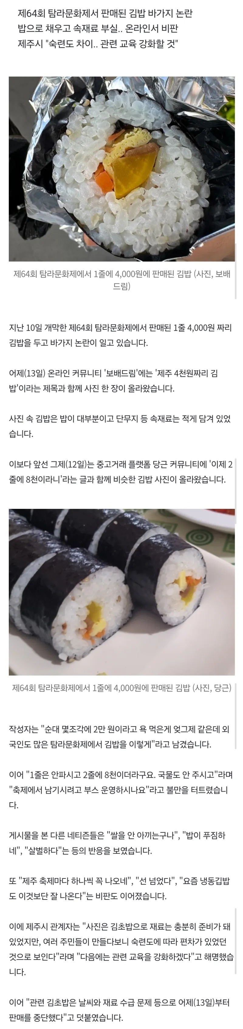 * | 쌀을 안 아끼는구나 1줄 4,000원 제주 축제 김밥 '뭇매' [4] | 낭인캠퍼 | 2025/10/16 |