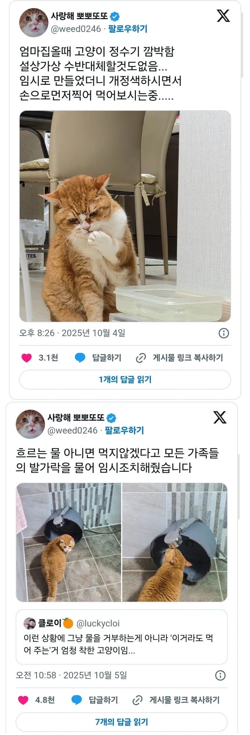 * | 엄마집에 올때 고양이 정수기를 안 가져온 대가 [3] | 향이있는밤 | 2025/10/17 |