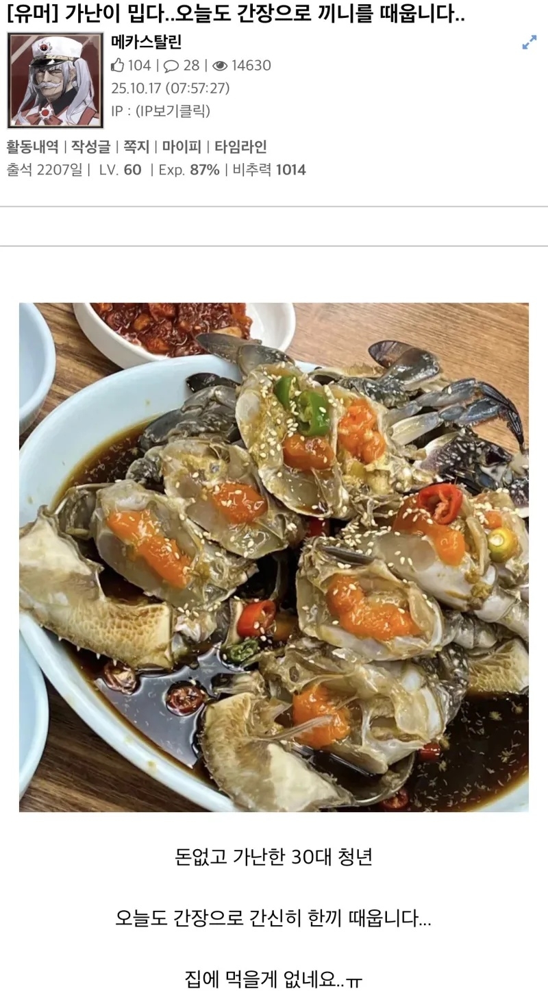 * | 돈없고 가난한 30대청년 오늘도 간장으로 간신히 한끼 때웁니다 [4] | 향이있는밤 | 2025/10/18 |