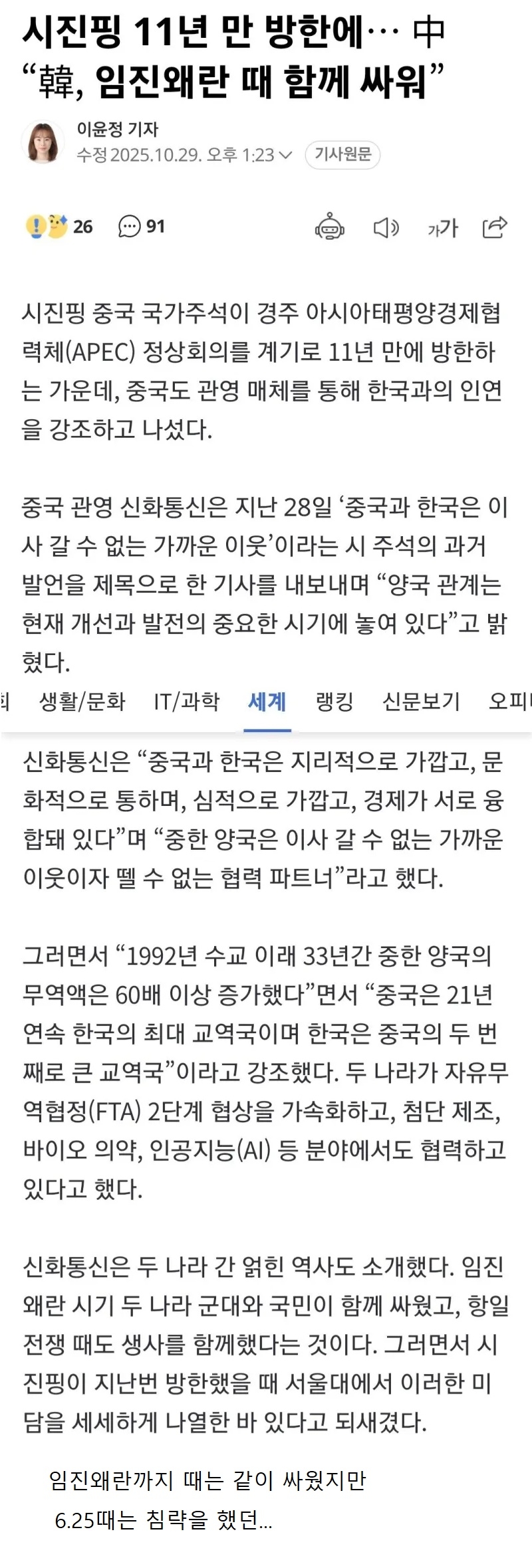 | * | 중국 관영매체 韓, 임진왜란 때 함께 싸워 [4] | 향이있는밤 | 2025/10/31 |