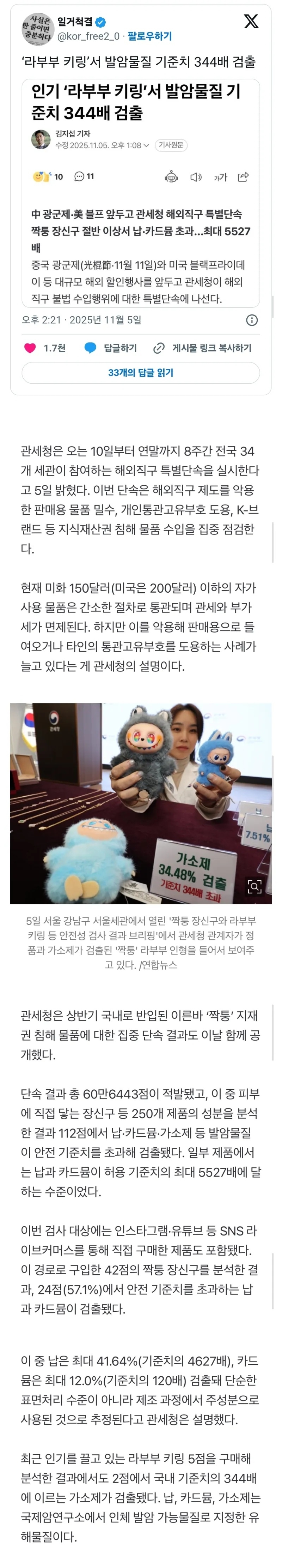 | * | 인기 ‘라부부 키링’서 발암물질 기준치 344배 검출 [3] | 낭인캠퍼 | 2025/11/08 |