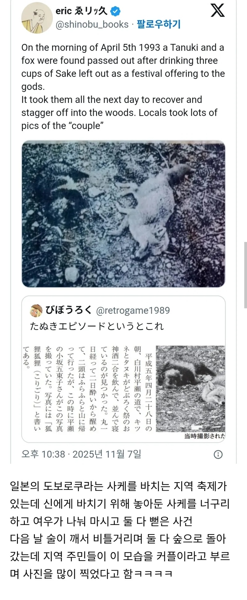 | * | 신사 근처에서 쓰러진채 발견된 너구리와 여우 [3] | 까칠한냥이 | 2025/11/10 |