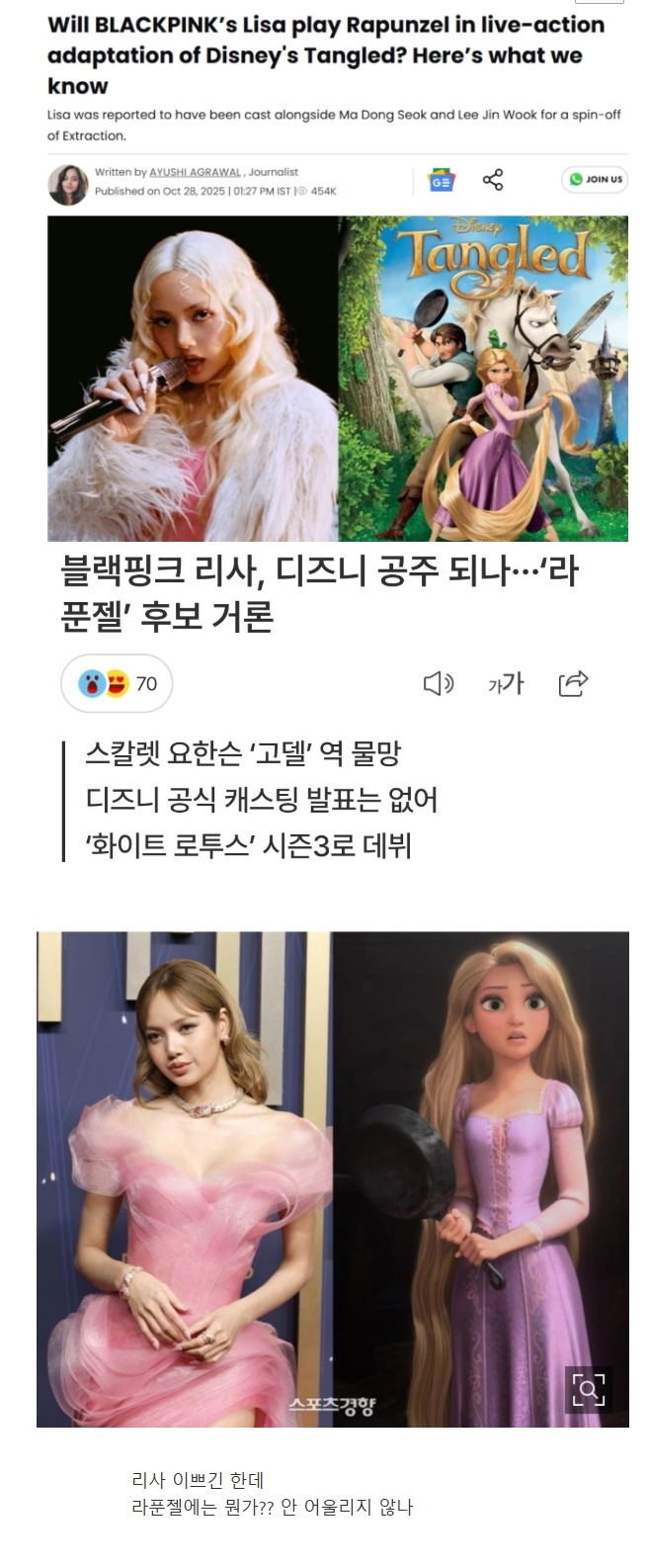 라푼젤은 저렇게 똑부러지는 이미지는 아닌데.. 리사 미인이지만 라푼젤이랑은 미스매치 같음
