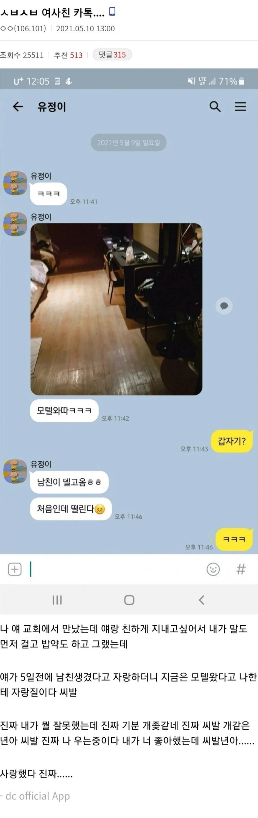 디씨에다 저걸 캡쳐해다 올리고 이런 놈인거 보면 여사친이 잘 떼어냈네