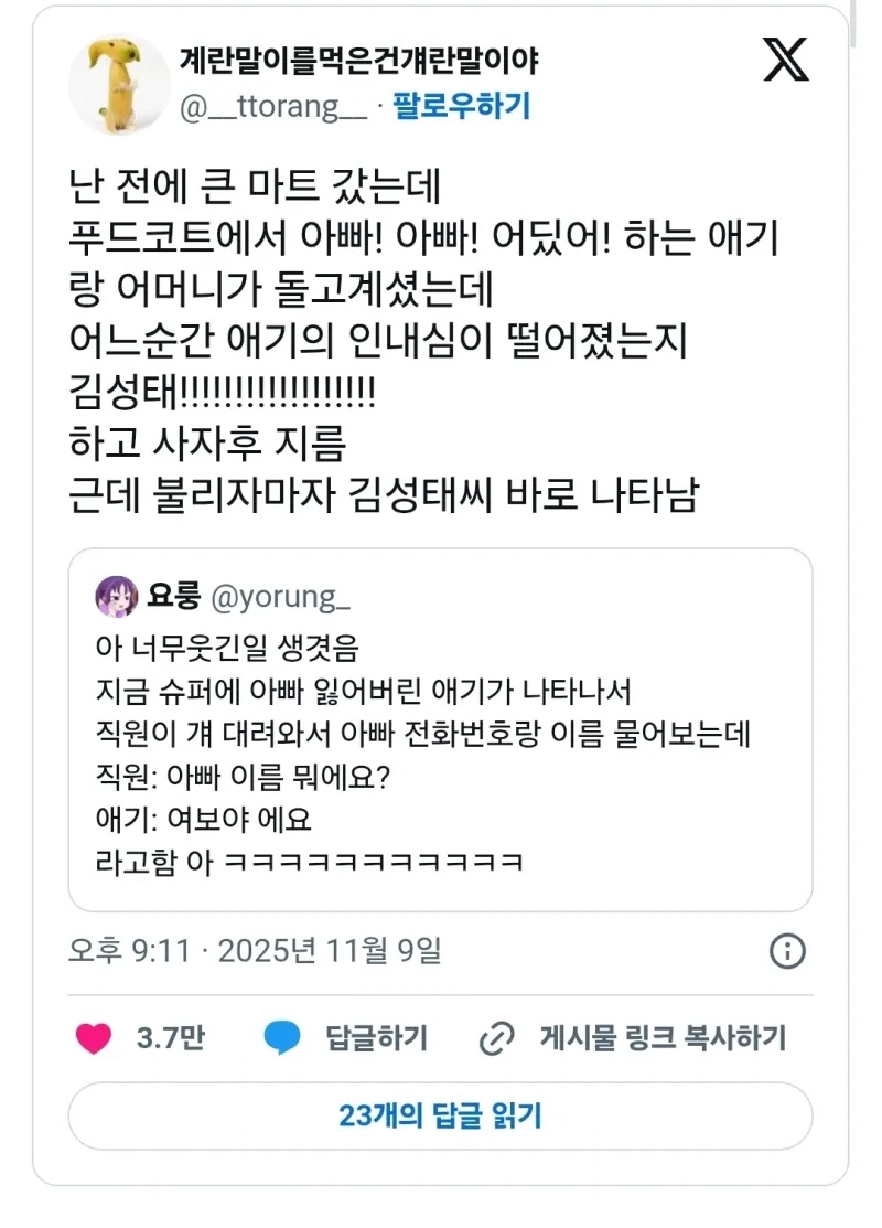 | * | 미아가 된 아빠를 찾다가 빡친 아기의 사자후 [3] | 하얀물결 | 2025/11/13 |