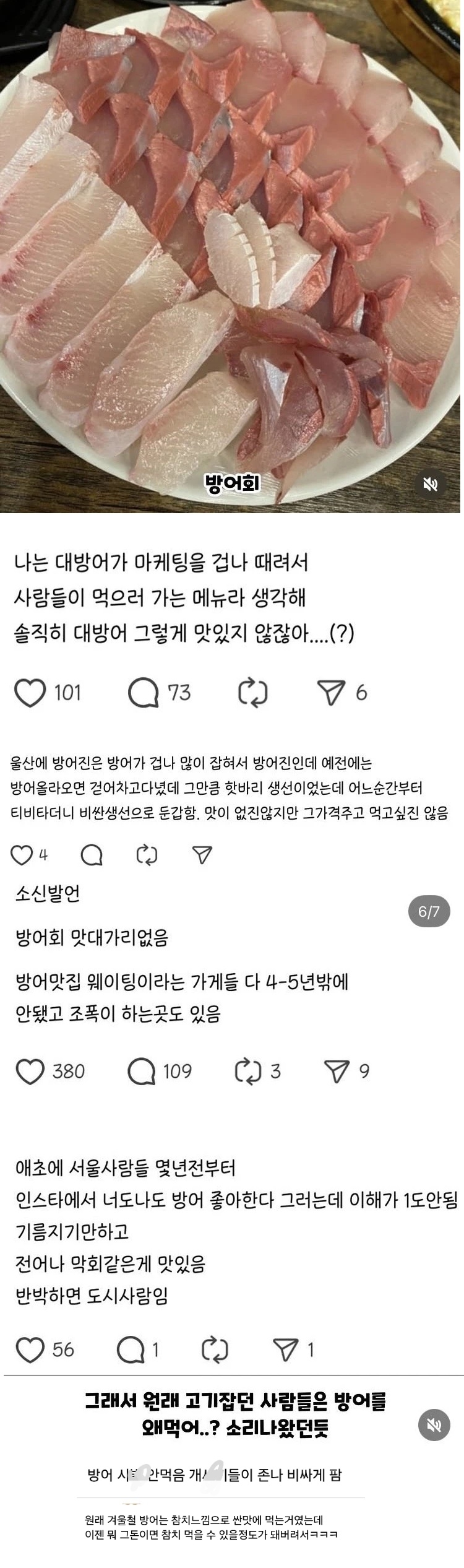 소주 안 좋아하는데 방어회 한점 하니 진짜 술술 들어가드라