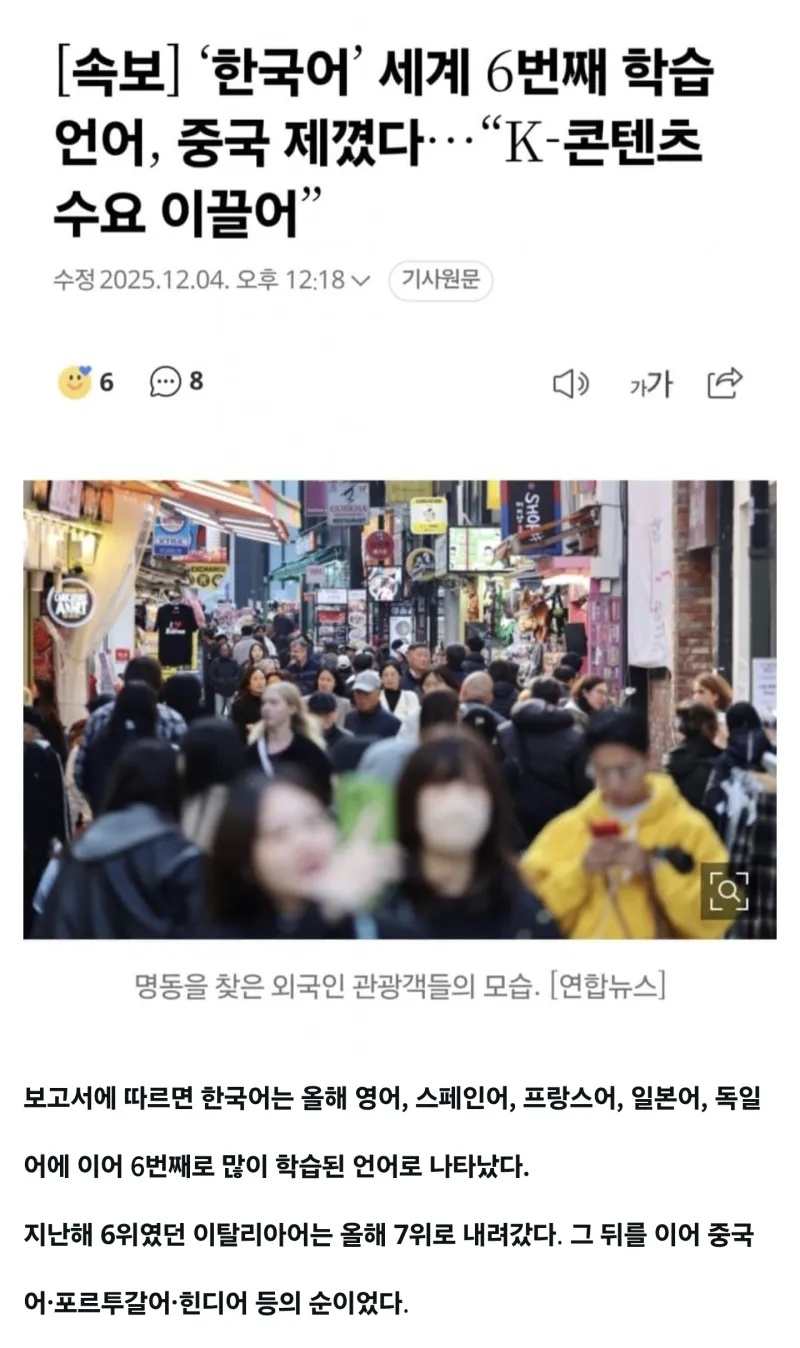 * 한국어, 세계에서 6번째로 학습 많이 된 언어 하얀물결 2025/12/07