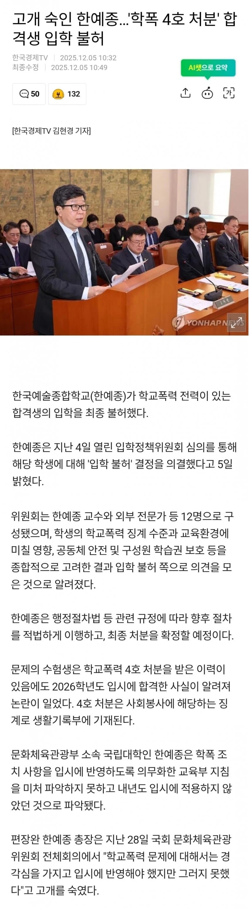 * 웃자갔던 학폭 가해자 합격시킨 한예종 근황 향이있는밤 2025/12/07