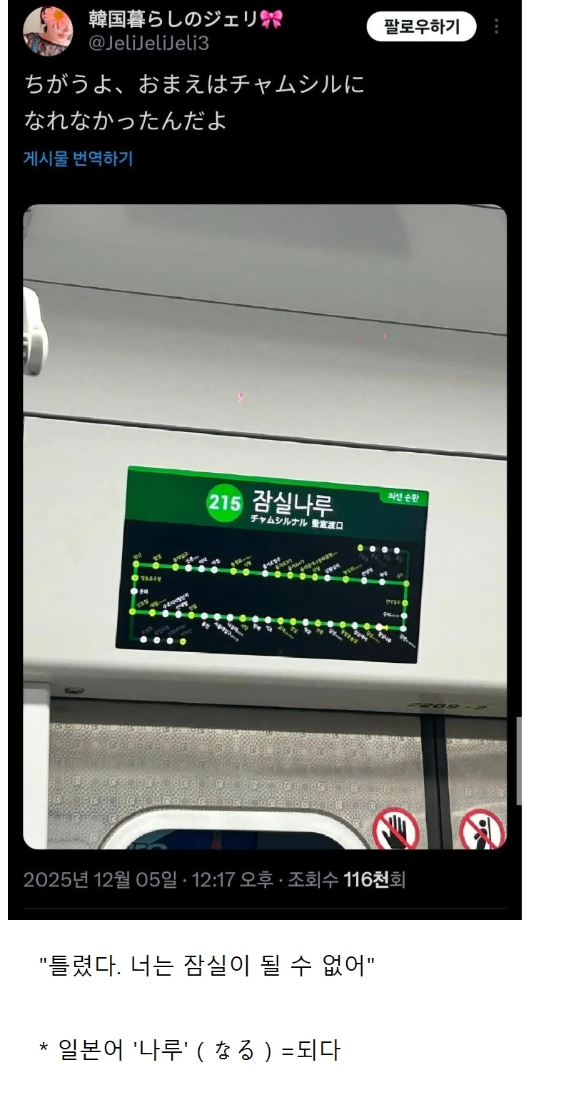 잠실새내 아니고 시내였으면 큰일 났을 뻔ㅋㅋㅋ(시내 일본어호 죽어란 뜻)