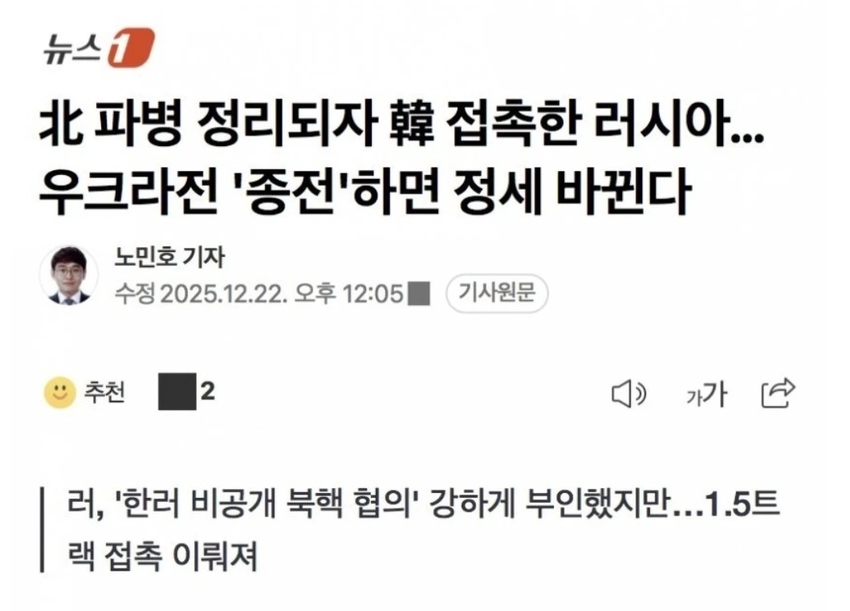 | * | 北 파병 정리되자 韓 접촉한 러시아…우크라전 '종전'하면 정세 바뀐다 | 까칠한냥이 | 2025/12/25 |