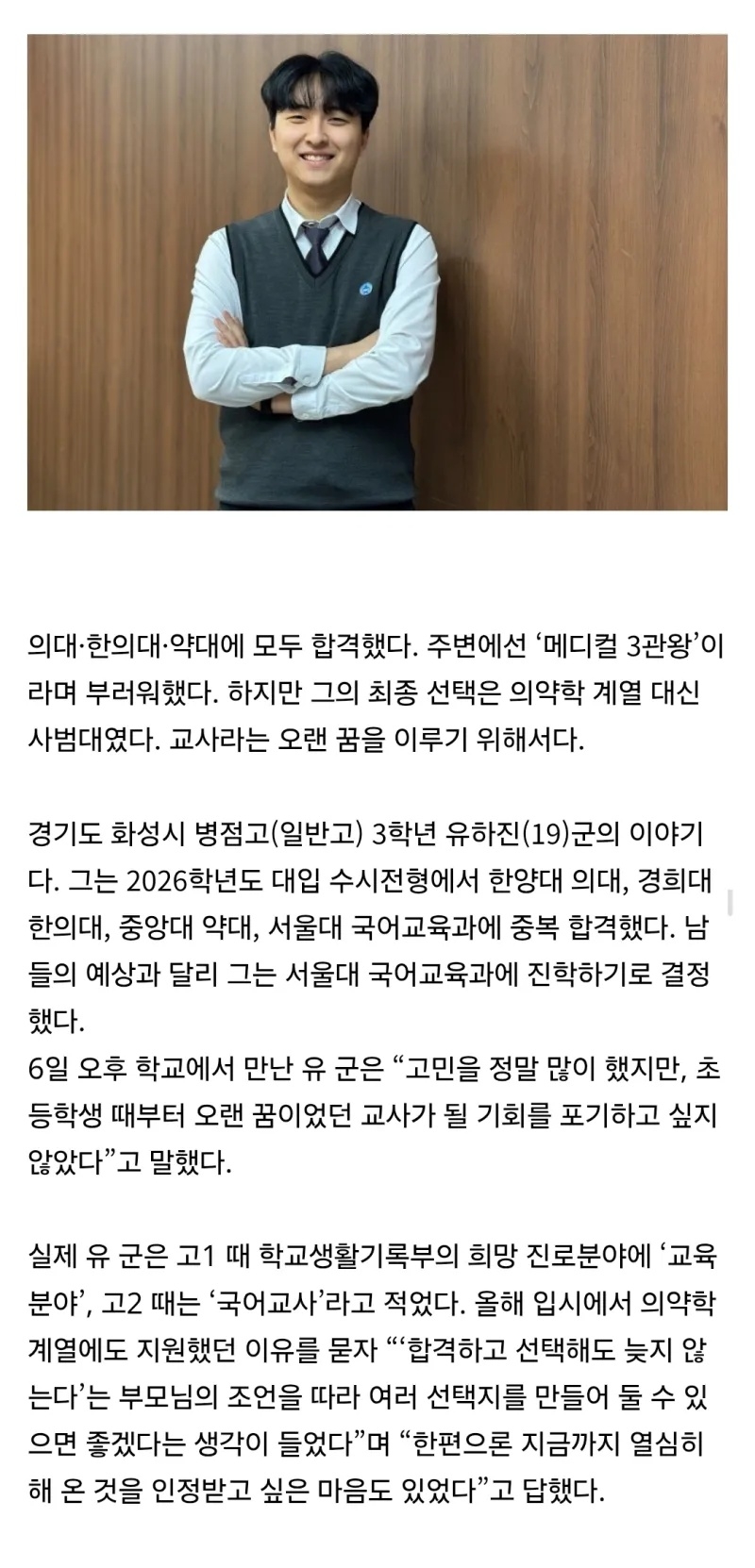 | * | 의대·한의대·약대 모두 합격 '대박'…이 고3은 사범대 택했다, 왜 [4] | 하얀물결 | 2026/01/10 |