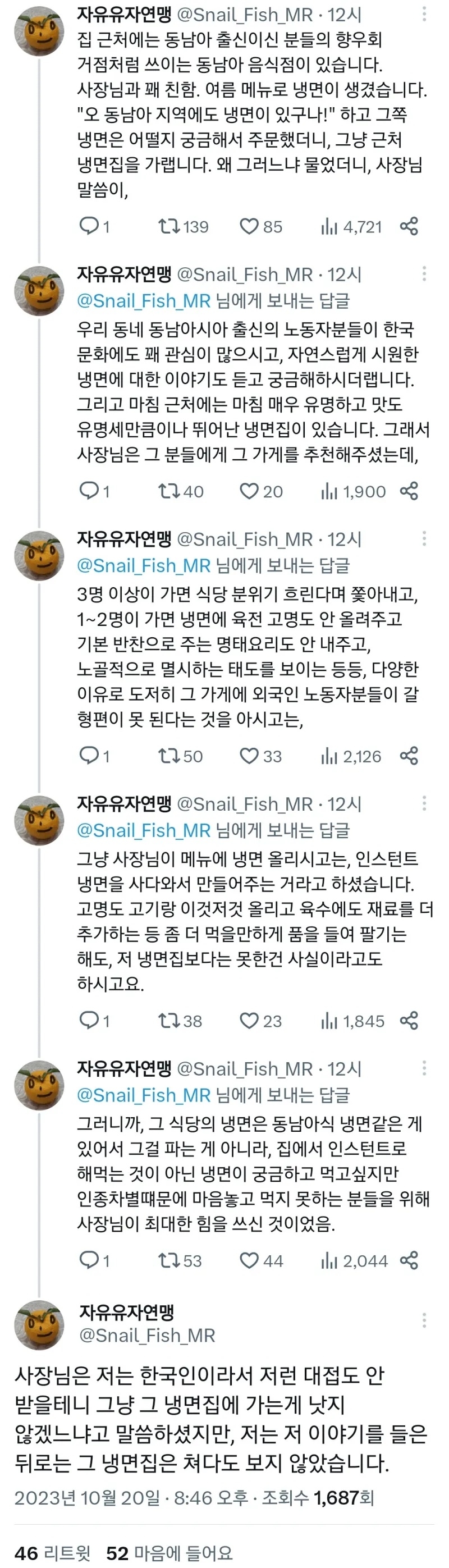 나중에 그 동남아인들이랑 같이 가서 차별없게 감시하면서 맛보여주고, 리뷰로는 사장님께 따끔한 맛 보여줘도 좋겠다