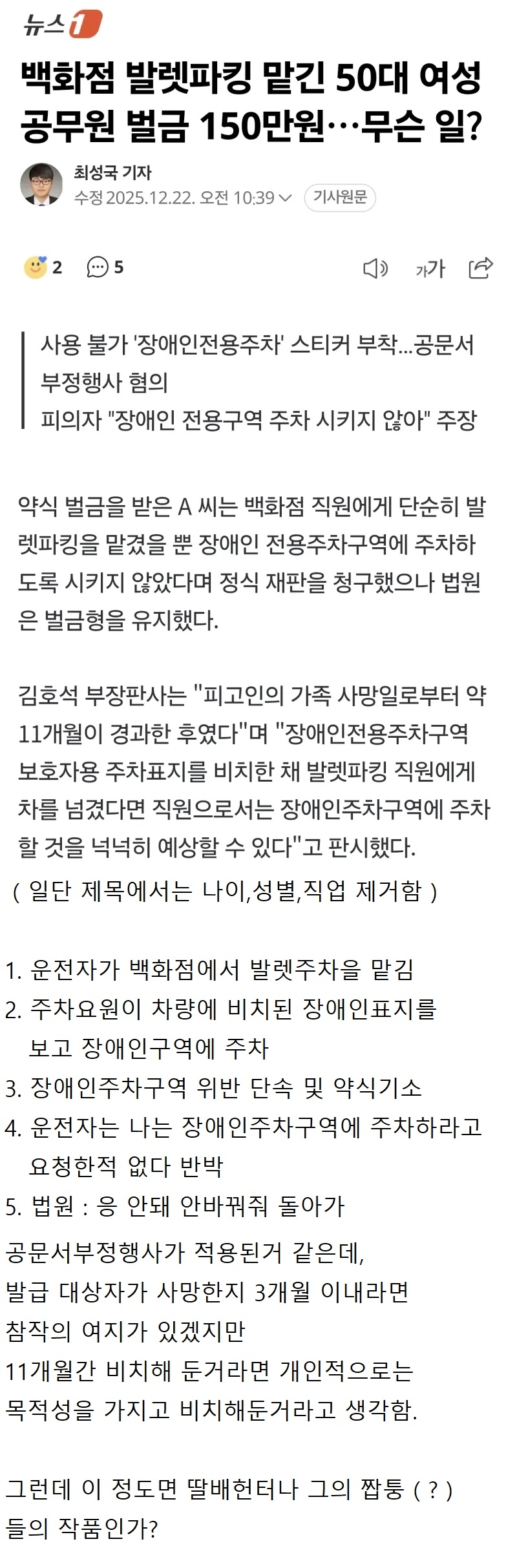 백화점 발렛파킹 맡긴 운전자 벌금 150만원