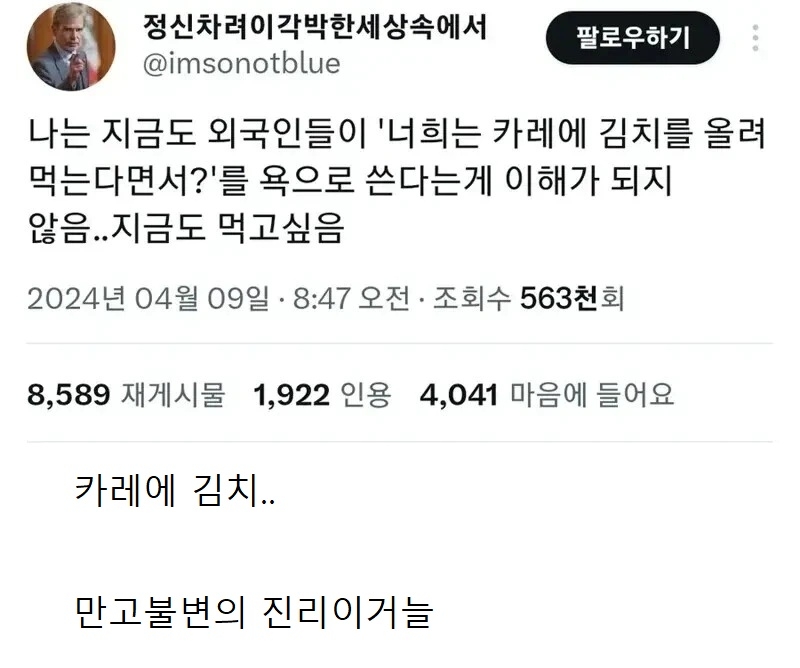 저것들 카레에 김치 얹어서 딱한번만 먹어보고 저소리 해보라 해봐. 다신 못할걸