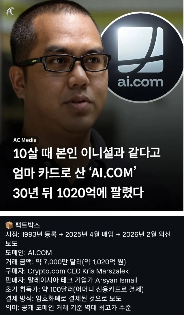 | * | 엄마 카드로 결제한 도메인 1,020억에 판매 | 향이있는밤 | 2026/02/13 |