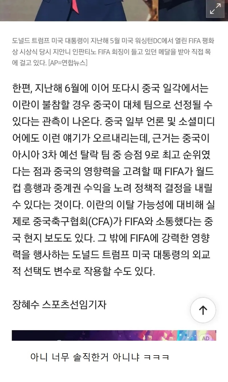 | * | 중국 축구협회 이란 불참 시 중국이 월드컵 나가게 해줘라 [4] | 하얀물결 | 2026/03/03 |