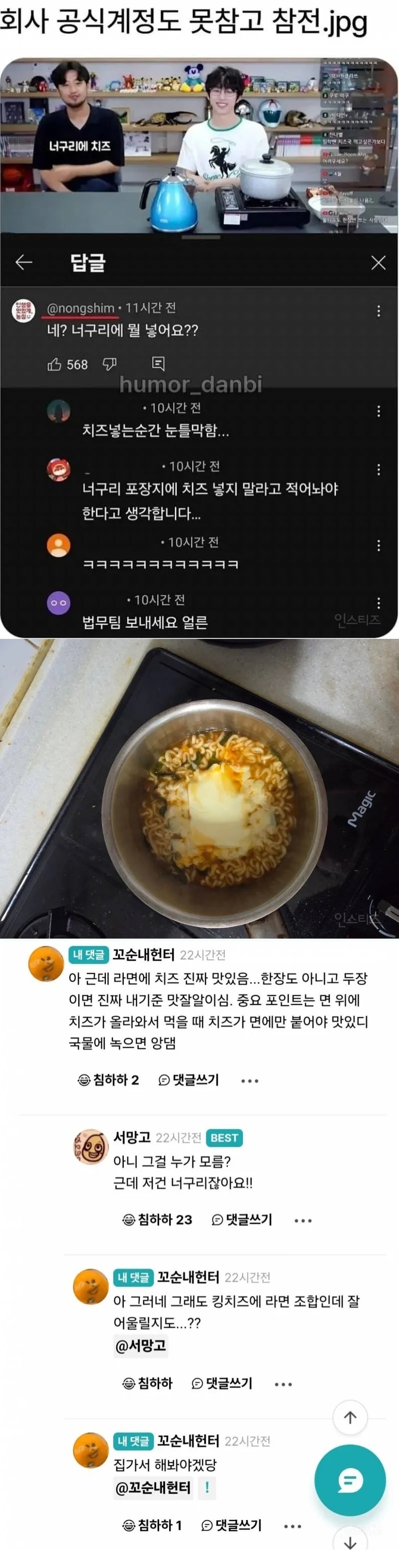 난 너구리 매운맛에 치즈는 안넣구 계란 넣어먹는디. 소주안주로 넘 조아