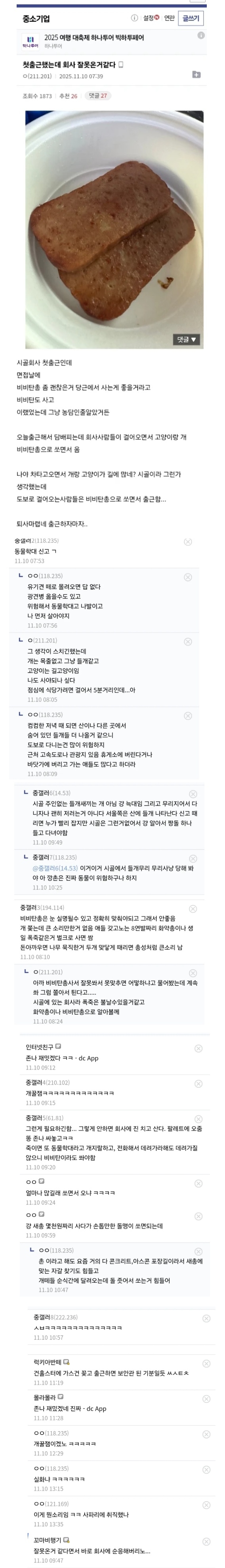 | * | [트래블] | 첫 출근날 회사 잘못온것같다 는 중소기업갤러리 [3] | 까칠한냥이 | 2025/11/12 |
