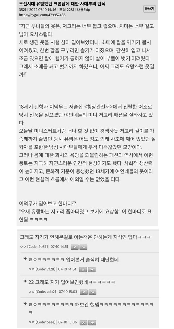 | * | [트래블] | 조선시대 유행했던 크롭탑에 대한 사대부의 탄식 [4] | 센키건 | 2025/11/13 |