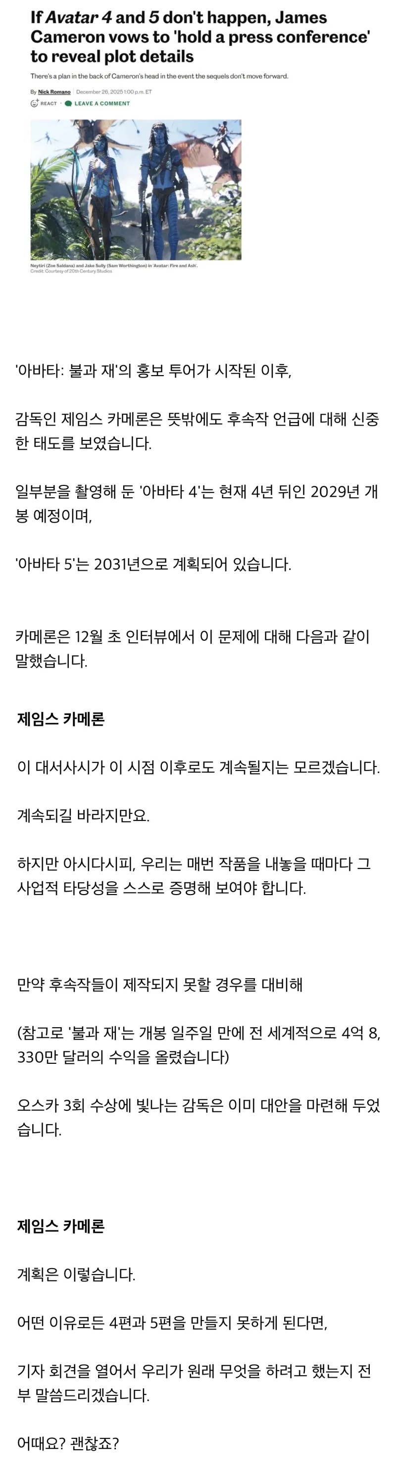 | * | [영화·애니·드라마] | 카메론 감독 아바타 4•5 제작 불발되면 결말 공개 기자회견 할 것 | 준이형 | 2025/12/29 |