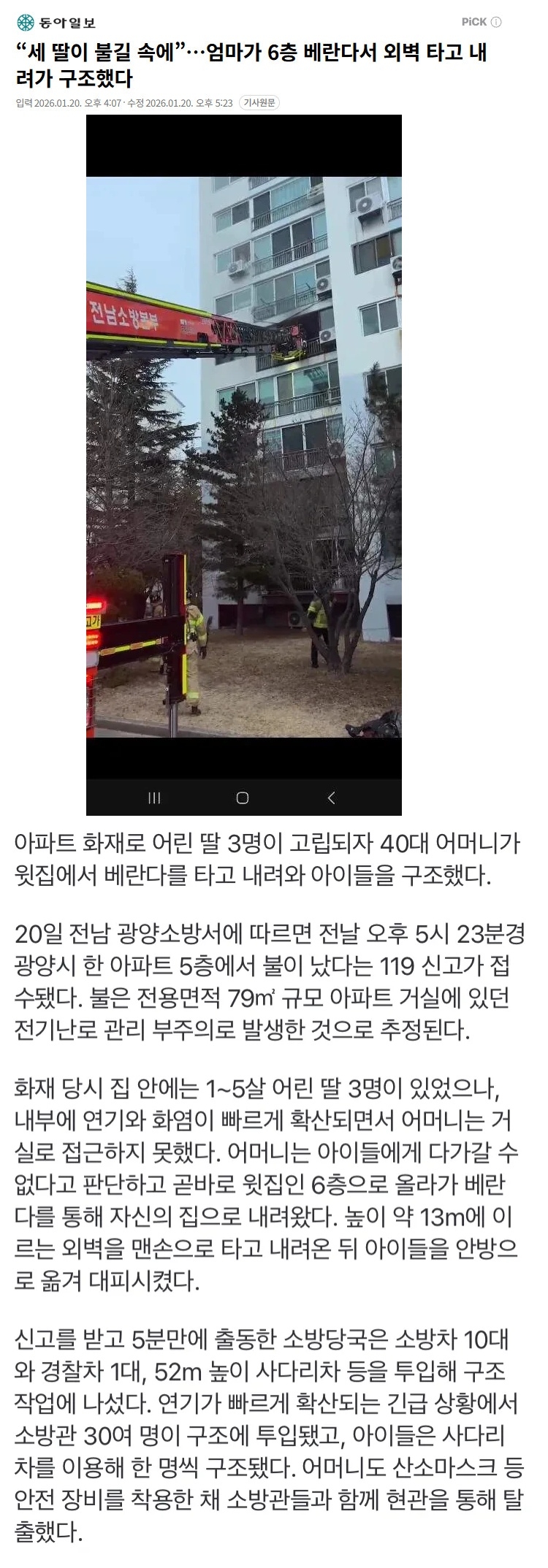 * [트래블] 세 딸이 불길 속에,엄마가 6층 베란다서 외벽 타고 내려가 구조 향이있는밤 2026/01/23