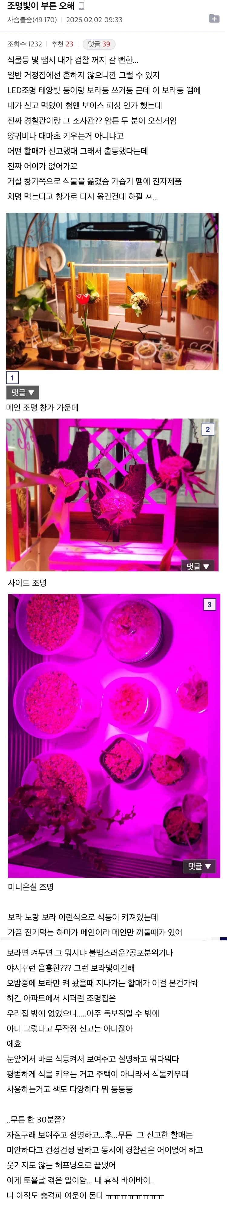 실내에 보라색 조명이면 확실히 그런거 재배한다고 오해 받을만 하지;