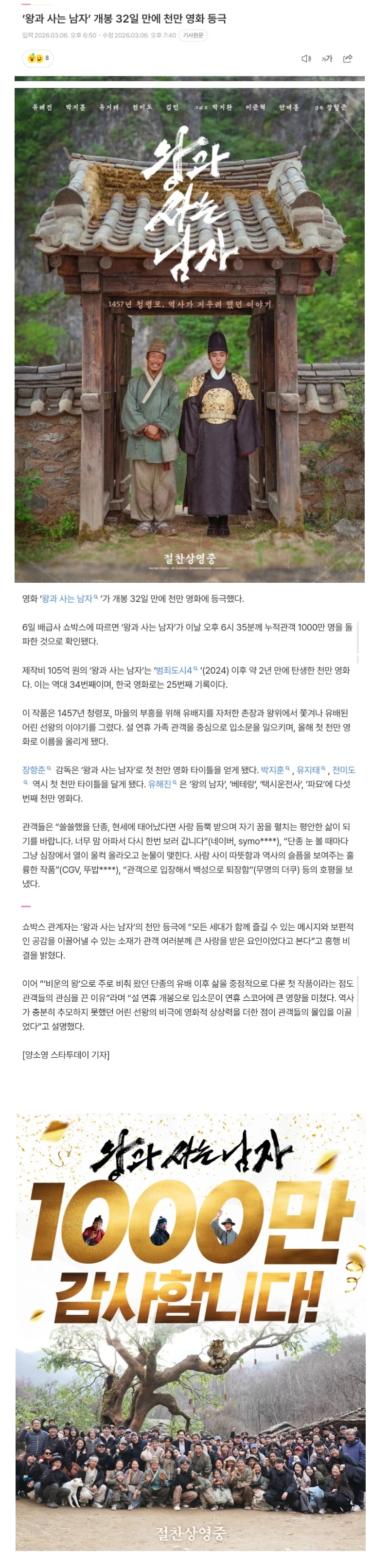 | * | [영화·애니·드라마] | 왕과 사는 남자 개봉 32일 만에 천만 영화 등극 [4] | 까칠한냥이 | 2026/03/08 |