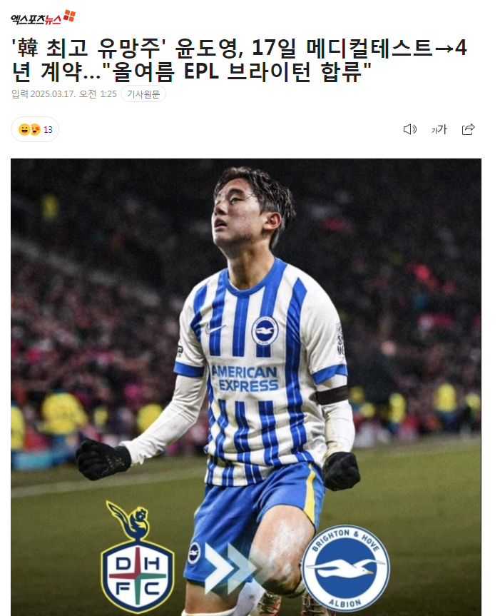 글로벌 매체 '디 애슬레틱'은 16일(한국시간) 브라이턴 앤드 호브 앨비언은 한국 윙어 윤도영 영입을 완료할 예정이라고 보도. 윤도영은 브라이턴에서 메디컬 테스트를 받아 이적을 확정한 뒤 다시 대전에 복귀할 것으로 전망.