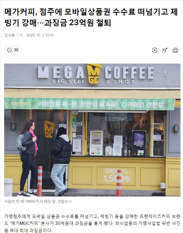 * | [머니] | 점주에 모바일상품권 수수료 떠넘긴 메가커피 역대 최대 과징금 | venaonnom | 2025/10/01 |