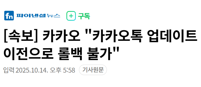 * | [머니] | 카카오 "카카오톡 업데이트 이전으로 롤백 불가" | 하춘하 | 2025/10/14 |