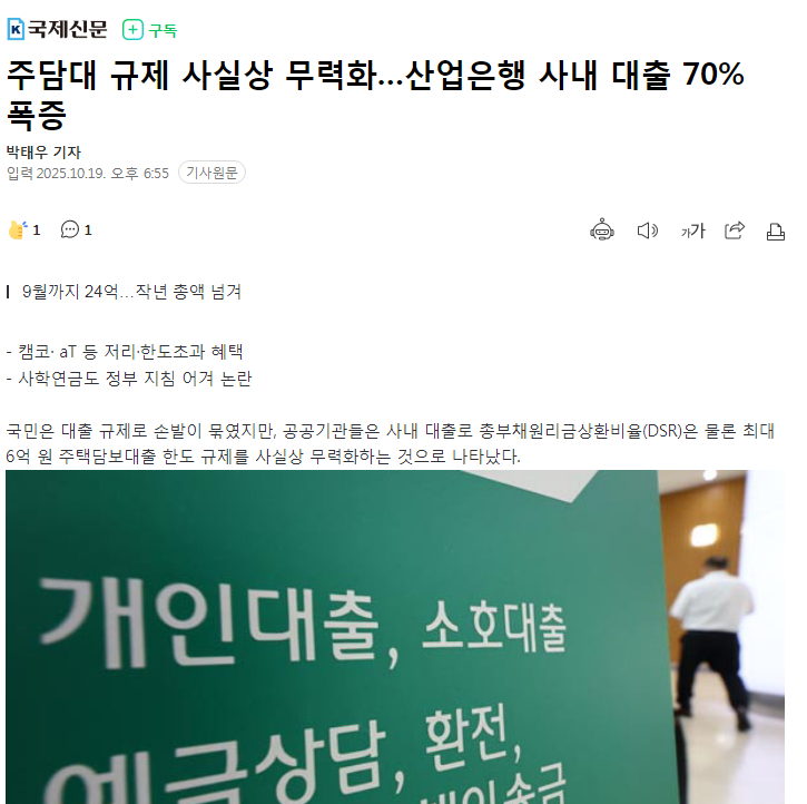 * [머니] 산은, 주담대 규제 사실상 무력화 카와이데쓰 2025/10/19