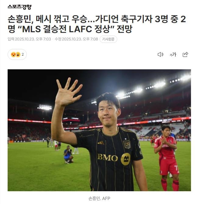 * | [스포츠] | 가디언 축구기자 3명 중 2명 손흥민 LAFC 우승 전망 [1] | 닥터소맥이 | 2025/10/23 |