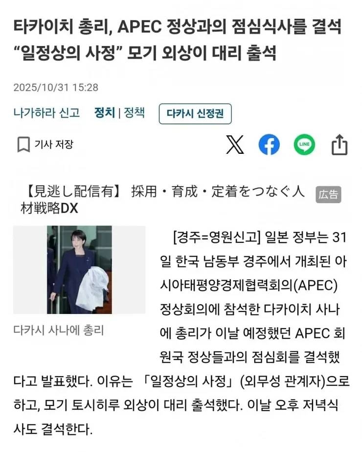 | * | [소셜] | 다카이치 총리, APEC 정상과 점심식사 결석 | EHFehf똘35 | 2025/11/01 |