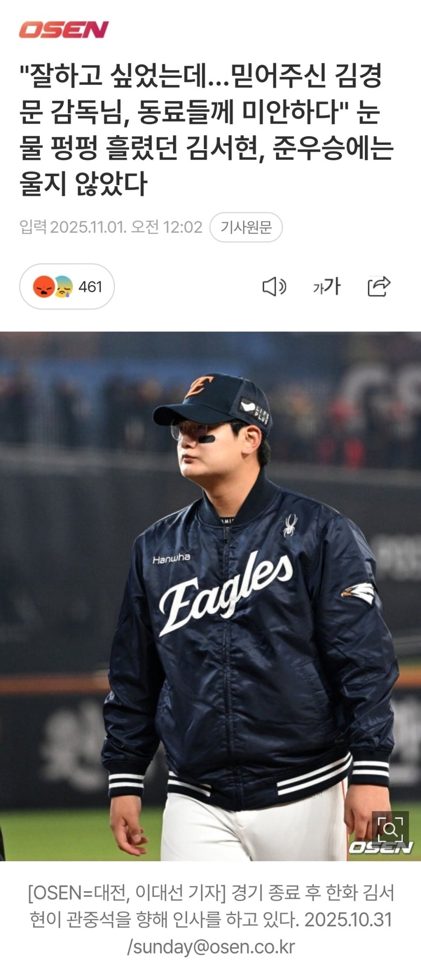 | * | [스포츠] | 한화 김서현 "믿어주신 김경문 감독님, 동료들께 미안하다". | 피자맛피자 | 2025/11/01 |