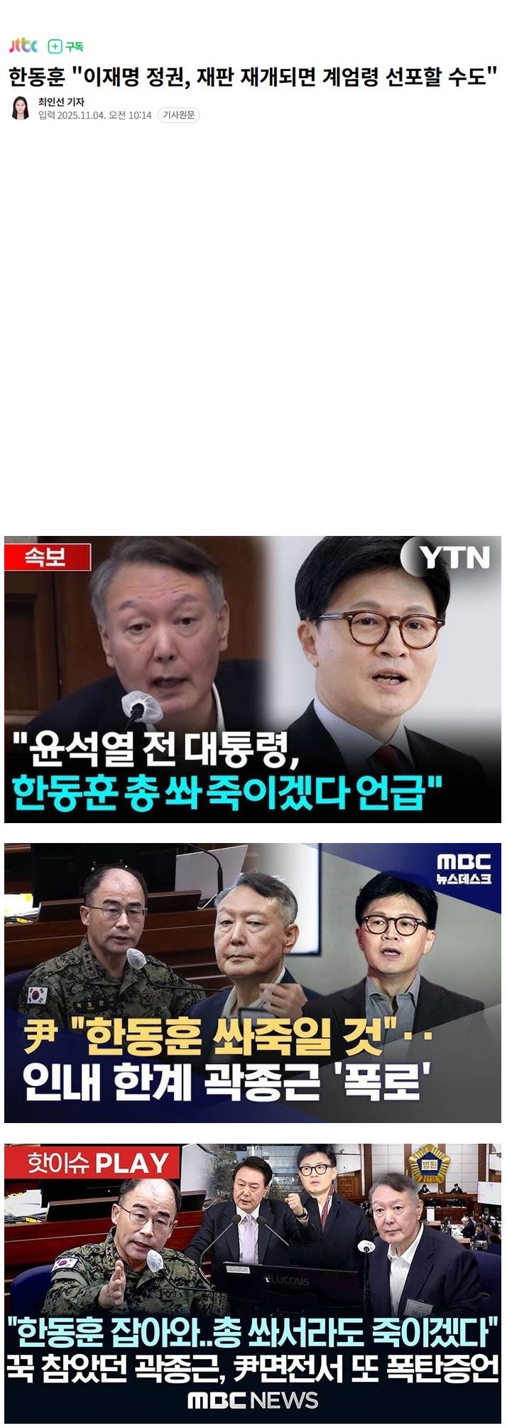 | * | [소셜] | 윤석열 "한동훈 쏴죽일 것" 한동훈 "이재명 정권, 계엄령 선포할 수도" [1] | 옥심아드로핀 | 2025/11/04 |