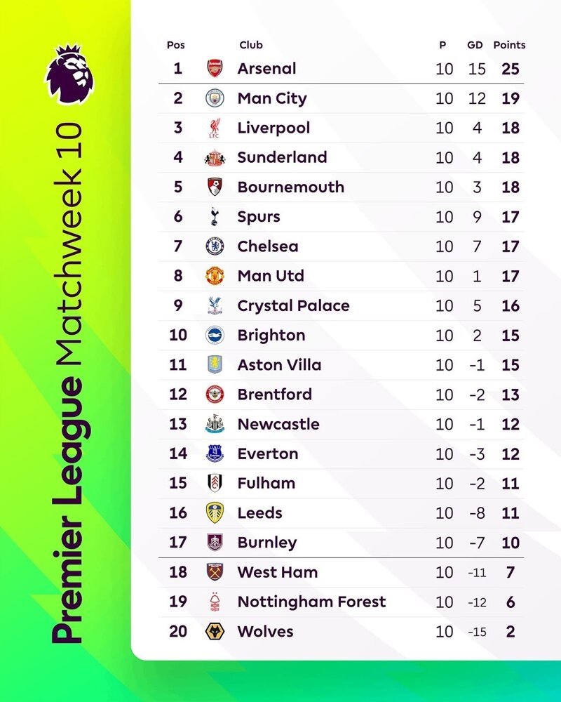 * [스포츠] 개막 10경기 마친 프리미어리그 현재 순위 닥터소맥이 2025/11/05