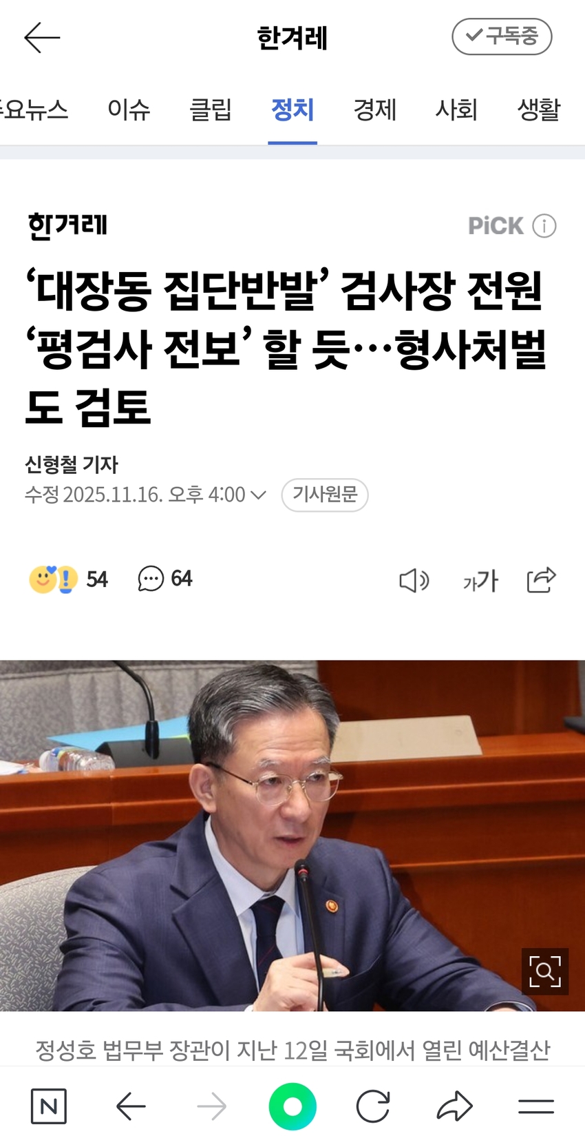 | * | [소셜] | 대장동 반발 검사장 전원 평검사 전보 예정 | 핸손은밥이지 | 2025/11/16 |