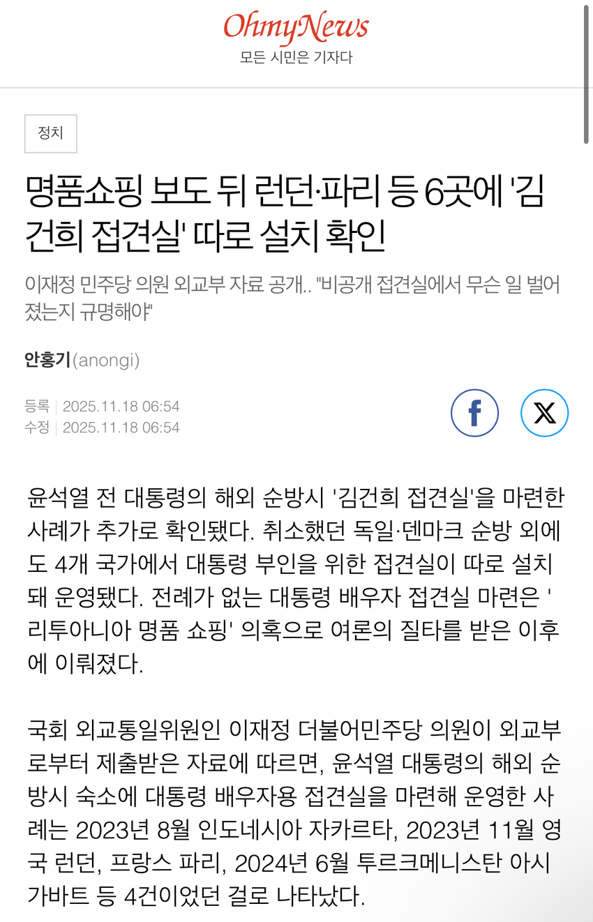 | * | [소셜] | 윤석열 해외 순방 때 김건희 접견실 따로 설치 | 러블라이즈 | 2025/11/18 |