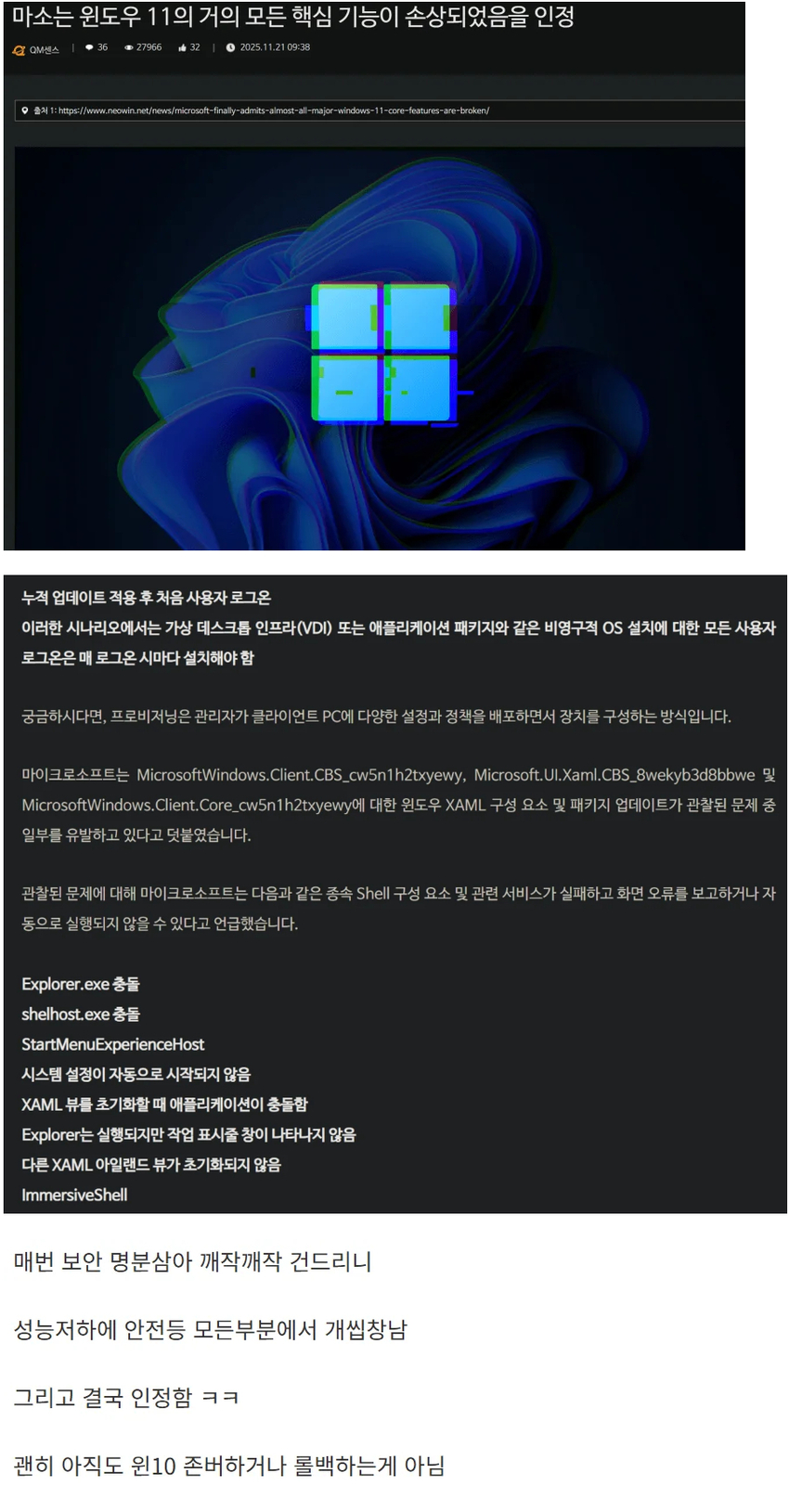 | * | [머니] | 현재) 난리난 윈도우 11 근황 | 크롬달탱92 | 2025/11/22 |