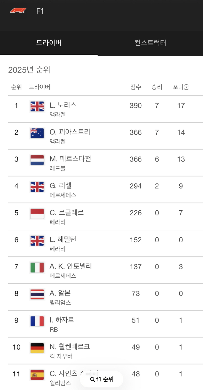 | * | [스포츠] | 2경기 남은 F1 25시즌 드라이버 순위 | 핸손은밥이지 | 2025/11/24 |