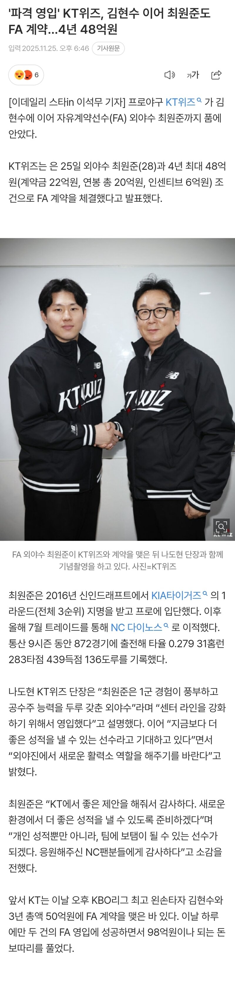 | * | [스포츠] | '파격 영입' KT위즈, 김현수 이어 최원준도 FA 계약...4년 48억원 [3] | ionme | 2025/11/25 |