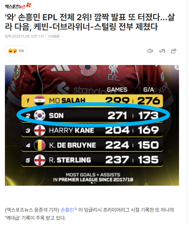 메나스풋볼HQ라는 축구콘텐츠매체가 25일 공개한 통계 자료를 보면 손흥민은 2017-2018시즌 이후 프리미어리그에서 271경기 출전, 173공격포인트를 기록하며 모하메드 살라(299경기 276공격포인트) 이어 해당 부문 2위.