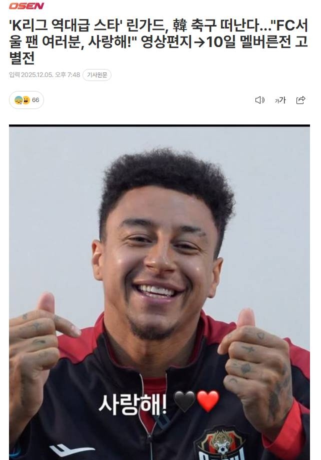 린가드 : FC 서울과 긍정적인 논의 끝에, 2025 시즌 종료 후 12월 10일 마지막 경기를 끝으로 팀을 떠나기로 합의했다. 쉬운 결정은 아니었다. 한국에서 보낸 시간은 정말 믿을 수 없을 만큼 훌륭했다. 축구, 분위기, 그리고 이 클럽에 대한 열정은 최고였다. 지난 2년 동안 여러분이 저에게 보여주신 사랑과 지지, 그리고 감사는 정말 놀라웠다. 이곳에서 축구를 한 것은 잊을 수 없는 경험이었고, 앞으로도 영원히 소중하게 간직할 거다. FC 서울, 팀 동료들, 스태프, 그리고 처음부터 저를 믿고 환영해 주신 클럽의 모든 분들께 감사드린다. 이렇게 큰 클럽에서 뛸 수 있었다는 기회에 항상 감사할 것이다.