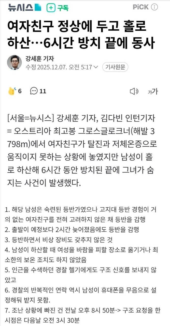 | * | [소셜] | 여친 정상에 두고 홀로 하산... 6시간 방치 끝 동사 [1] | 양밤갱2개 | 2025/12/07 |