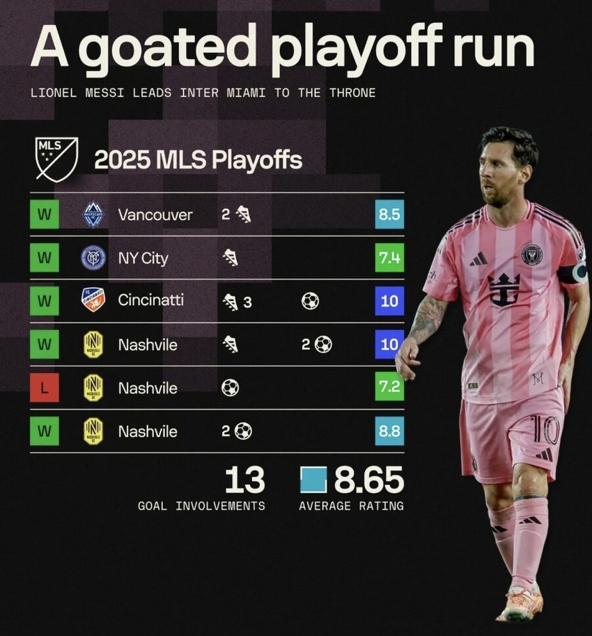 메시는 2025 MLS 플레이오프에서 전 경기 공격포인트를 기록하는 전대미문의 선수로 등극