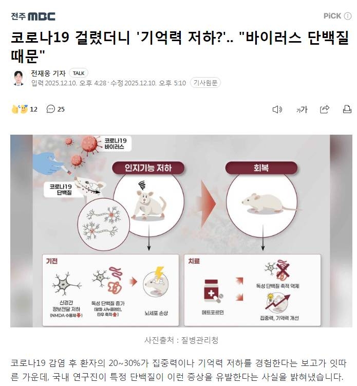 하튼 기사 내용은 질병관리청 국립보건연구원은 코로나19 바이러스의 돌기를 이루는 단백질이 뇌에 영향을 미쳐 기억 형성 유전자 발현을 방해하고, 치매나 파킨슨병과 관련된 독성 단백질을 축적시킨다는 연구 결과를 발표. 연구진이 쥐에게 해당 단백질을 투여하고 지켜본 결과, 쥐들이 미로를 탈출하는 시간이 지연됐고, 낯선 공간에서 불안 증세도 증가해 인체의 인지 저하 현상과 유사한 양상 파악.
