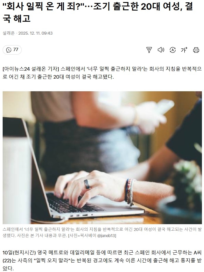 그는 매일 오전 6시 45분에서 7시 사이에 출근해 왔으며, 이는 회사가 정한 근무 시작 시간인 오전 7시 30분보다 약 40분 이른 시각. 계속 이른 시간에 출근해 정식 근무 전까지 별다른 업무 없이 시간을 보냈으나 사측은 이를 규칙 위반으로 판단해 해고 결정. A씨는 부당 해고라며 법적 대응에 나섰으나, 법원은 회사의 조치가 정당하다고 판단.