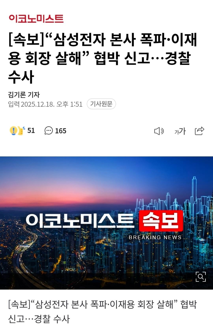| * | [머니] | 삼성전자 본사 폭파에 이어 이재용 회장 살해 협박 신고 [1] | 팔라이니야 | 2025/12/18 |