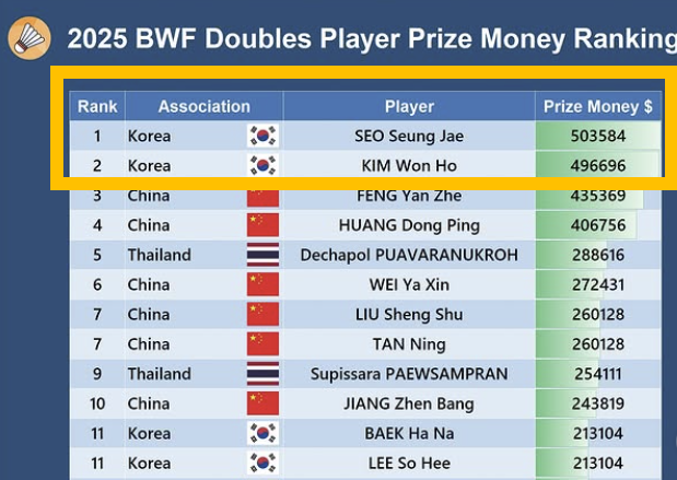 남자 복식 서승재-김원호 조 역시 상금 세계 1, 2위.
