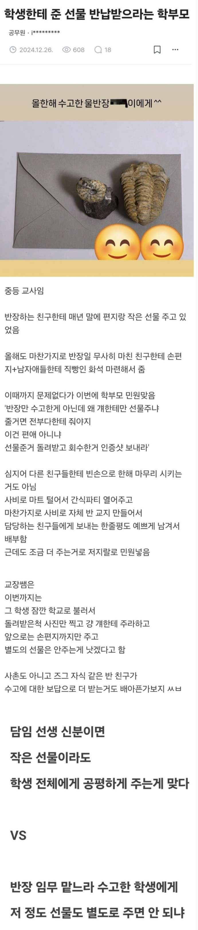 | * | [프리] | 담임 선생이 반장에게 선물준거 회수하라는 학부모 [1] | 크롬달탱92 | 2026/01/04 |